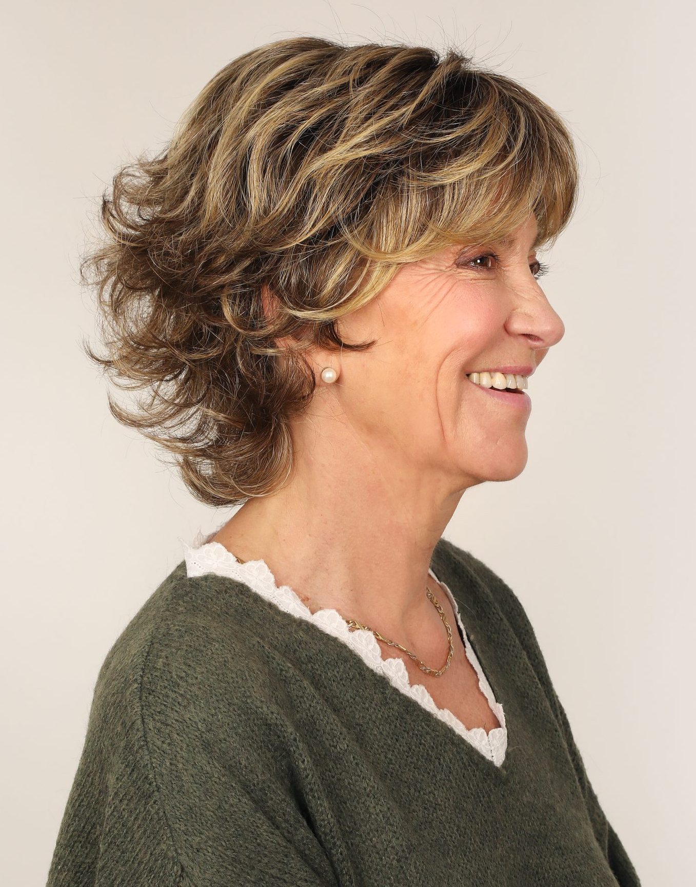 D’une extrême qualité, cette prothèse capillaire Doria de Luxe vous apportera un confort remarquable. Sa coupe courte et bouclée encadre joliment le visage, adoucissant les traits. Elle a un mouvement constant, avec des mèches qui bougent librement, créant une sensation de fluidité et de souplesse.